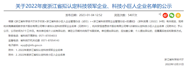 本次評(píng)選根據(jù)《浙江省科學(xué)技術(shù)廳關(guān)于印發(fā)<浙江省科技小巨人企業(yè)管理辦法(試行)><浙江省科技領(lǐng)軍企業(yè)管理辦法>的通知》(浙科發(fā)高〔2022〕34號(hào))有關(guān)規(guī)定,由浙江省科學(xué)技術(shù)廳于近日公布認(rèn)定結(jié)果。