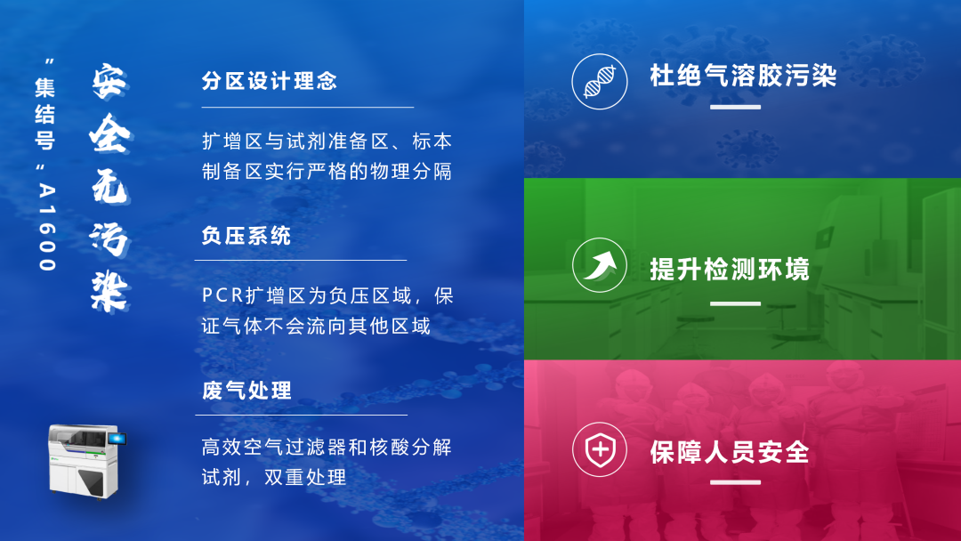 通過特殊的分區(qū)設(shè)計(jì),封閉、負(fù)壓系統(tǒng),搭載廢氣處理單元三重設(shè)置,防止氣溶膠污染,提升檢測(cè)環(huán)境,保障實(shí)驗(yàn)環(huán)境安全,結(jié)果可靠。