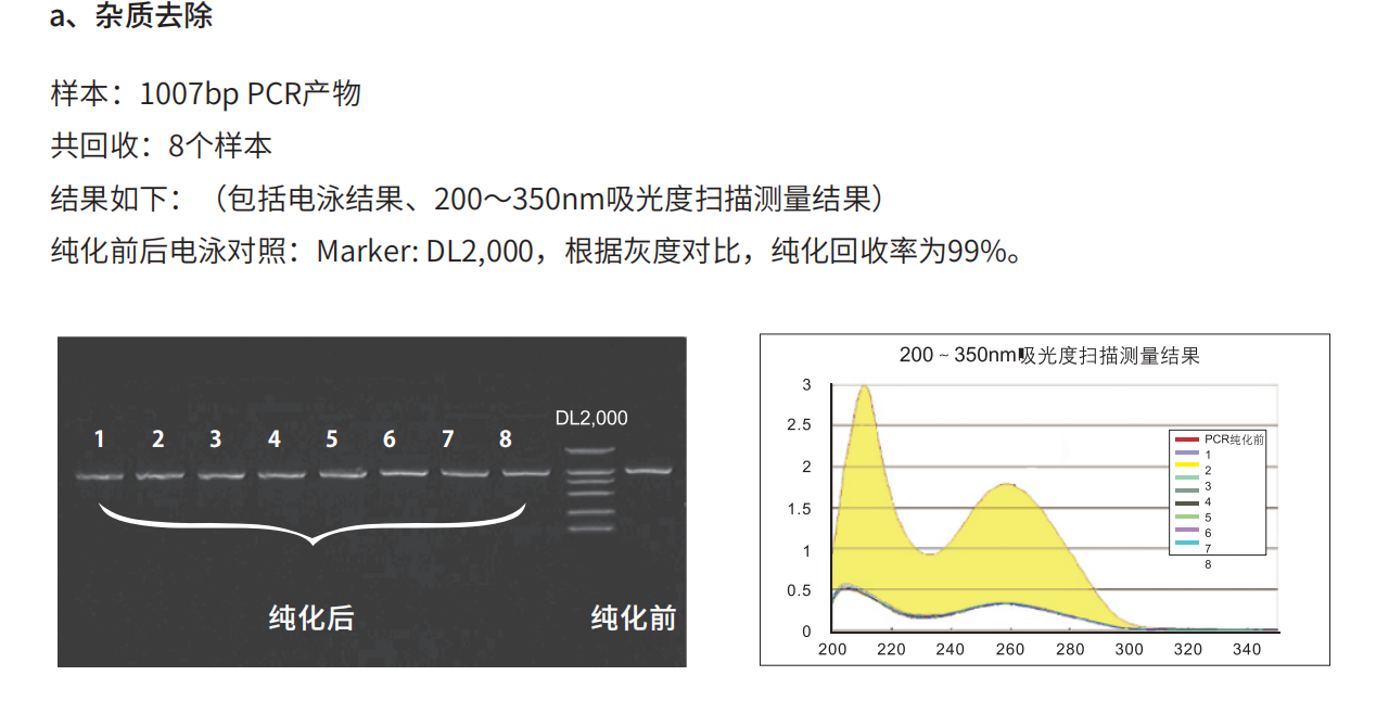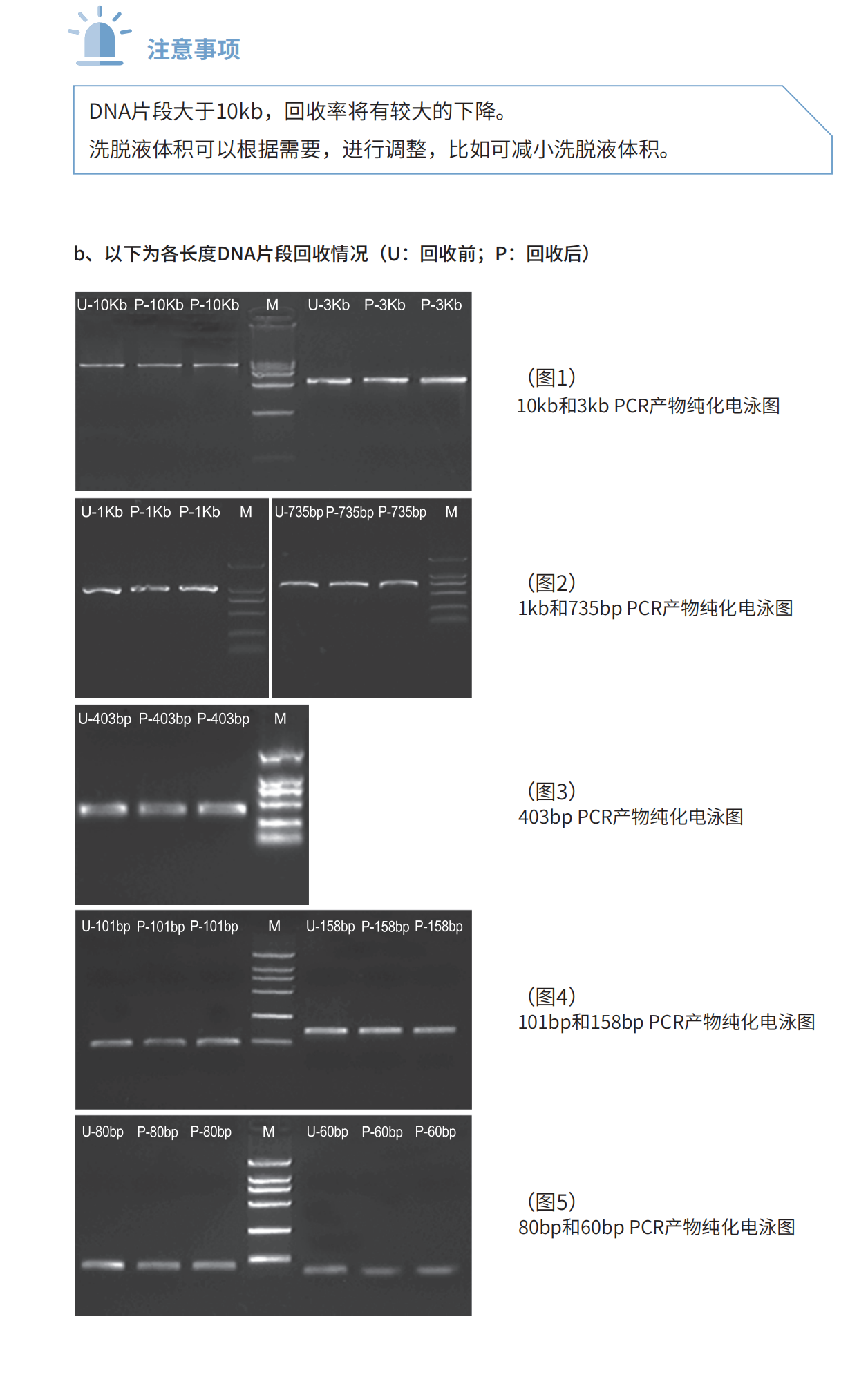 Biospin PCR 產(chǎn)物純化試劑盒提供了一個從PCR反應產(chǎn)物及其它酶促反應物中簡單、快速、有效地提取純化高質(zhì)量DNA,去除蛋白質(zhì)、dNTP、引物等雜質(zhì)的技術(shù),適合提取的DNA片段長度為60bp~10kb,小于100bp片段提取效率為23~95%,0.1~10kb片段提取效率為90~97%。純化的DNA可以應用到各類下游分子生物學實驗。