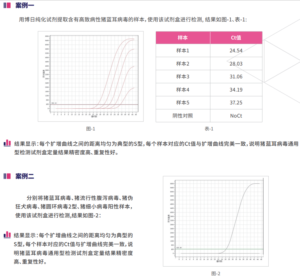 豬藍(lán)耳病毒(PRRSV)有一個(gè)顯著的特點(diǎn),即具有高抗體滴度的豬仍可大量排出PRRSV,給該病的防治帶來非常大的難度。本試劑盒引入豬源管家基因作為非競爭性內(nèi)參用來監(jiān)控整個(gè)檢測過程,使得檢測結(jié)果更加準(zhǔn)確可靠,適合豬藍(lán)耳病毒美洲株、豬藍(lán)耳病毒歐洲株、高致病變異株。