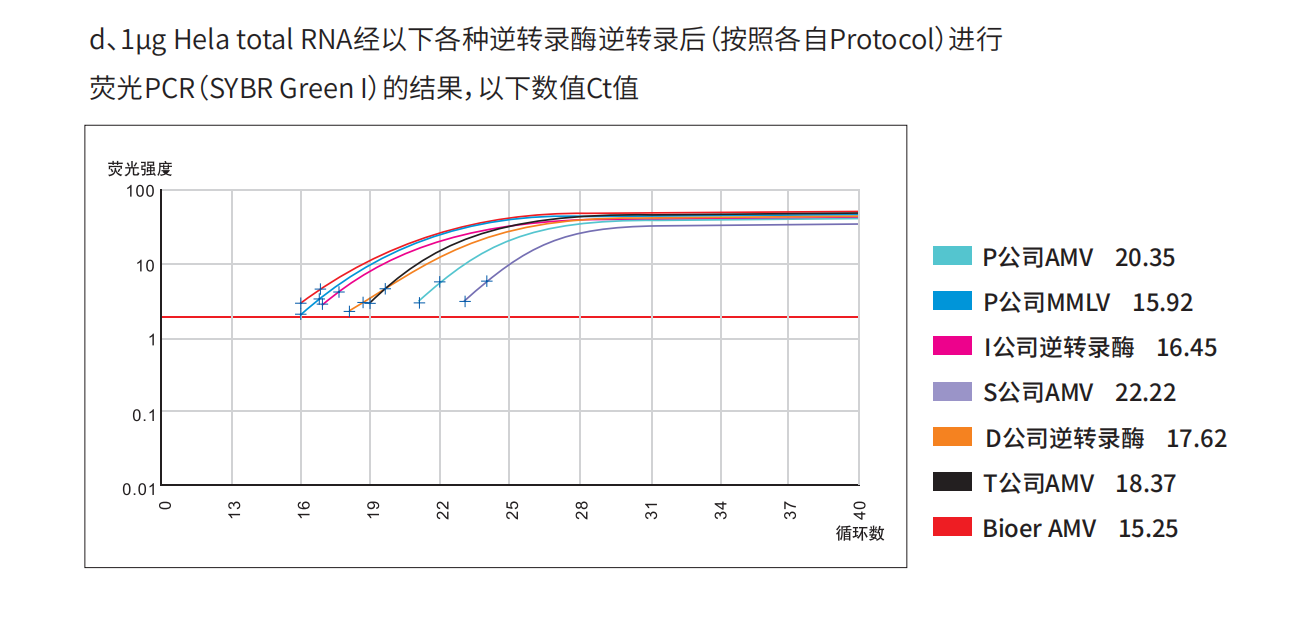 RT007 AMV逆轉錄酶分離自禽類成髓細胞瘤病毒(AMV),其方法由Houts等人的方法改進?來。分離得到的酶是分子量為157KD的αβ全酶。本酶經高度純化,完全無核酸污染。本酶可用于cDNA合成,也可用于RNA和DNA的雙脫氧測序。RT007 AMV逆轉錄酶以總RNA或polyA+RNA為模板,具有以RNA為模板的DNA聚合酶活性,DNA為模板的DNA聚合酶活性和RNaseH酶活性,最適反應溫度在42?55℃,最高可達60℃,如果使用焦磷酸鈉,最適溫度為37~41℃。專利配方的RT反應緩沖液根據不同用途可以作為5x或10x反應液使用(詳見標準使用方法),同時可抑制RNase H酶活性。按照標準使用方法可以得到?至10?12kb cDNA。RT007 AMV逆轉錄酶比普通AMV逆轉錄酶和MMLV逆轉錄酶能耐受更高的溫度和合成更長的cDNA。