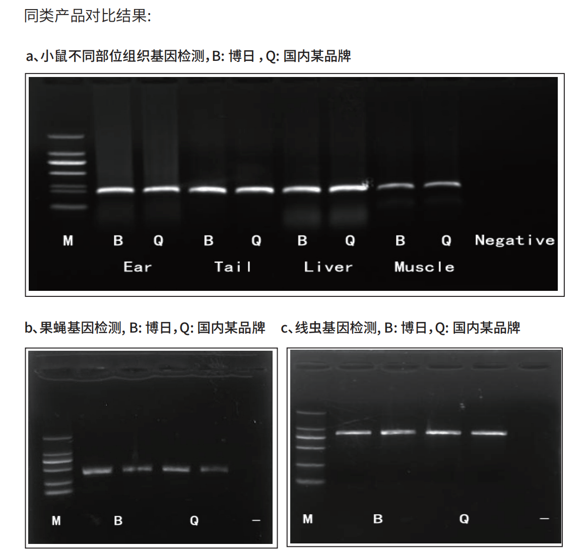 本試劑盒采用特殊的裂解緩沖體系可以快速釋放出動物組織樣本中的核酸。本試劑盒操作簡便安全,無需酚/氯仿等有毒有機溶劑,無需液氮研磨等特殊處理。本產品對PCR體系進行了優(yōu)化,使PCR具有更高的特異性,更強的PCR反應抑制物耐受性。樣本需求量少,5mg的樣本亦可以進行實驗。本產品可以應用于動物內臟、肌肉、果蠅等動物組織的直接PCR。