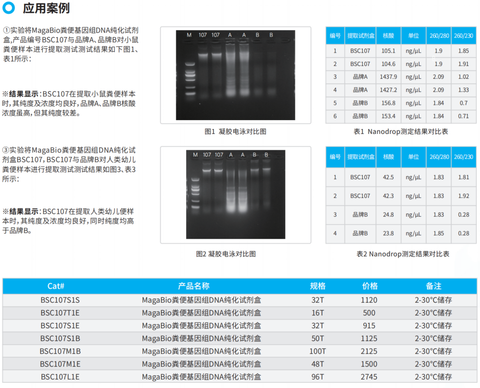 糞便基因組DNA檢測(cè)是研究腸道微生物、胃腸道疾病診斷重要途徑之一,糞便基因組DNA產(chǎn)物質(zhì)量對(duì)腸癌癌早期診斷水平起到關(guān)鍵作用,有助于降低腸癌的致死率并減少受檢者的痛苦。但糞便樣本成分復(fù)雜,糞便基因組DNA提取困難。 博日MagaBio糞便基因組DNA純化試劑盒是博日開(kāi)發(fā)的一款專(zhuān)門(mén)針對(duì)糞便樣本的磁珠法提取試劑盒,獨(dú)特設(shè)計(jì)的中和液,可以有效沉淀蛋白質(zhì)、多糖等雜質(zhì),有效去除糞便中各種影響下游實(shí)驗(yàn)的抑制因子,實(shí)現(xiàn)快速、安全的核酸分離純化。