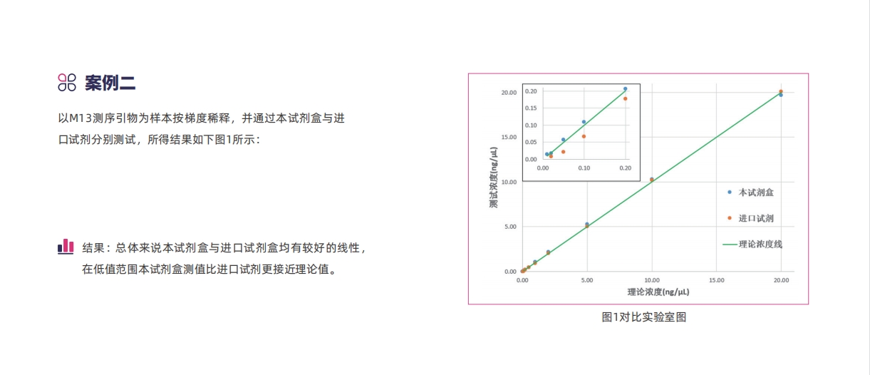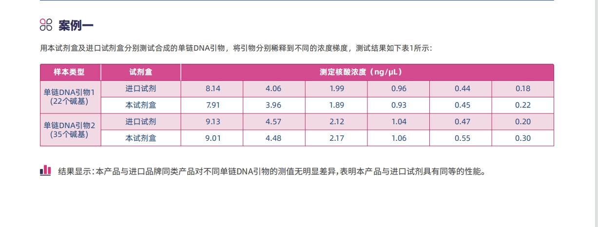 操作便捷:工作液直接與樣本混合孵育上機,無需稀釋流程更便利; 靈敏度高,線性范圍寬:10 pg/μL到240 ng/μL濃度范圍內具有較好線性; 耐抑制性好:多種常規(guī)污染物如鹽、溶劑、去污劑和蛋白質等無檢測干擾; 應用范圍廣:可用于不同來源的ssDNA的核酸定量。