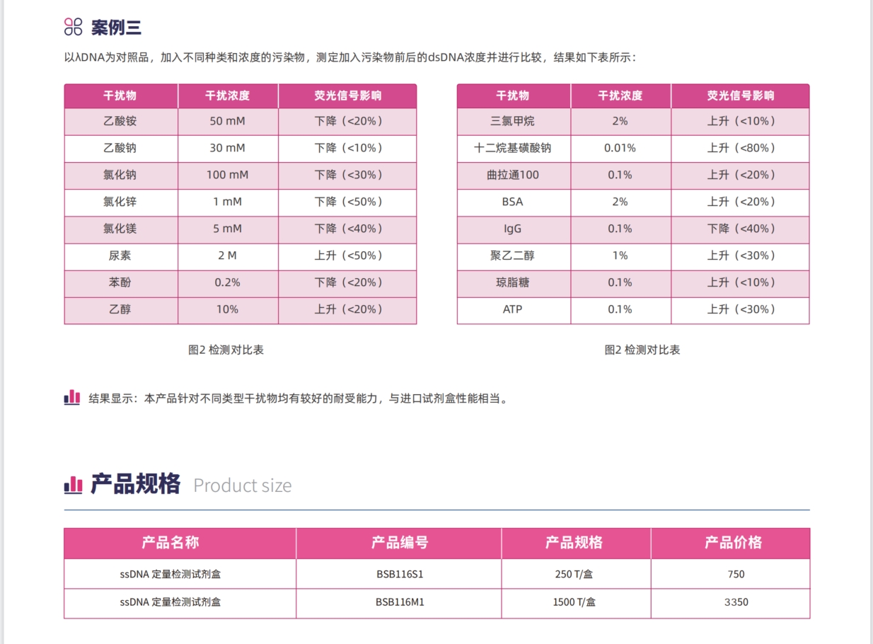 博日ssDNA定量檢測試劑盒是一種便捷、精確的單鏈DNA(ssDNA)熒光定量檢測試劑盒。根據加樣體積的變化,本產品可以對初始濃度范圍在 10 pg/μL到240 ng/μL之間的樣品進行精確定量,并且對一些常規(guī)的污染物,如鹽、溶劑、去污劑和蛋白質等都有較好的耐受性。本試劑盒可用于 檢測寡聚核苷酸或長單鏈DNA。核苷酸以及6個或更少堿基的短單鏈DNA對定量檢測沒有干擾。本試劑與雙鏈DNA(dsDNA)或RNA結合后會表現 出熒光增強。